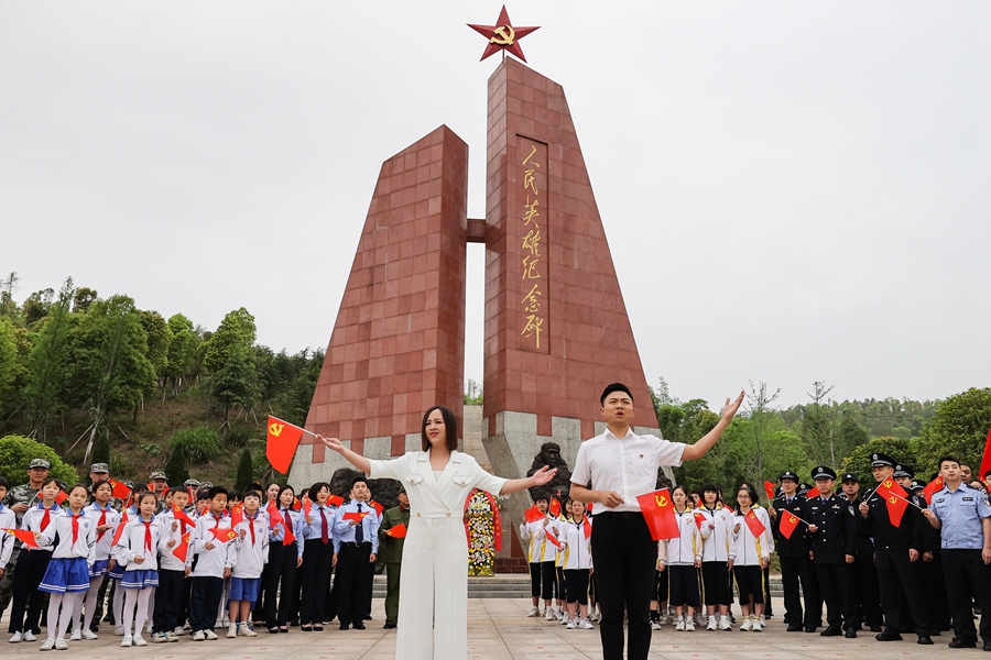 4月2日,临武县黄龙山植物园英雄广场,市民在演唱歌曲《不忘初心》。当天,该县开展“重温红色记忆,汲取奋进力量”清明祭扫活动,社会各界人士以瞻仰人民英雄纪念碑,重温入党誓词,讲述临武党史,录制“快闪”等形式,传承英烈精神,弘扬革命传统。 陈卫平 摄