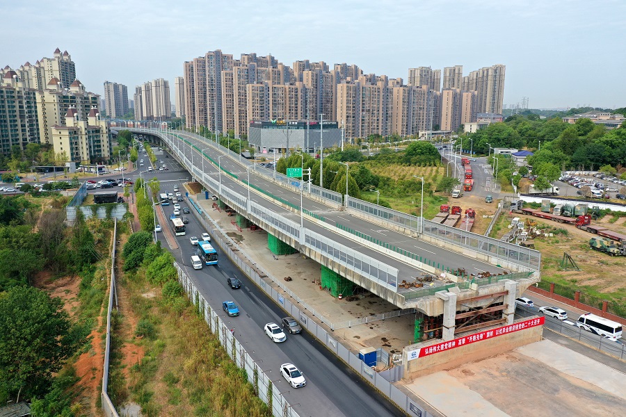 9月7日,长沙市万家丽路高架桥与福元路交叉口北侧,高架落地段桥梁已顶升到位,正在进行桥下墩柱施工。万家丽路快改北延线采取高架形式,旧桥通过顶升与新建的万家丽路高架桥在空中“牵手”并继续北延。桥梁顶升工程于8月初启动,经过一个月的施工,旧桥这段长150米的桥梁被顶升0~5.4米。这是目前湖南省内最大规模的桥梁顶升工程。湖南日报全媒体记者 田超 摄