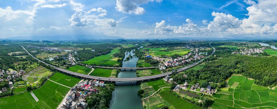 8月24日,道贺高速和207国道道县段,产业基地与村庄、河流相映成景。近年来,该县大力推进交通基础设施建设,加快构建综合交通网络体系,有力推动了当地乡村旅游发展和农产品市场拓展。 蒋克青 摄