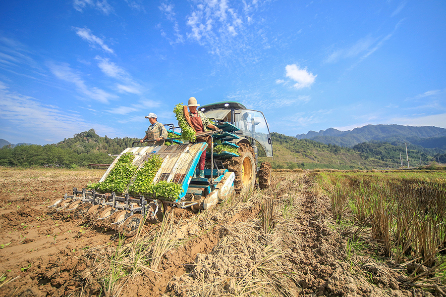 10月28日,龙山县苗儿滩镇黎明村,农民驾驶农机在收割后的稻田栽种油菜苗。深秋时节,该县农民利用冬闲田种植油菜,提高土地利用效率。 曾祥辉 摄(湖南图片库)