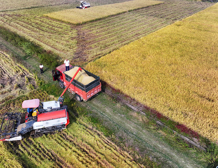 10月28日,澧县大堰垱镇戴家河村,农机手驾驶收割机收割晚稻。深秋时节,该县农民抢抓晴好天气,做好晚稻机收作业,确保颗粒归仓。 柏依朴 胡锐 摄影报道(湖南图片库)