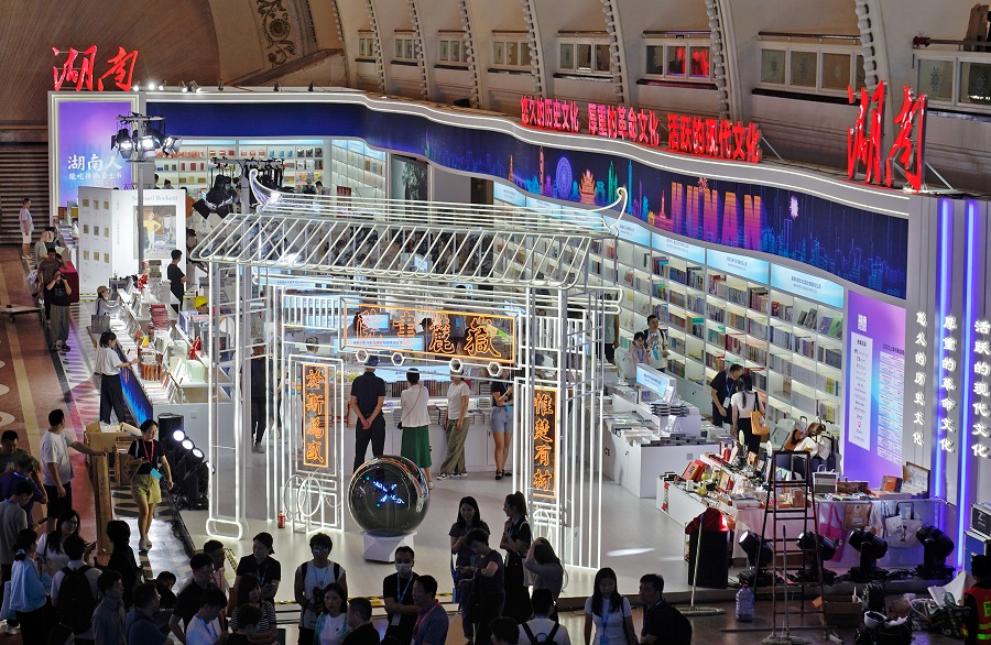 8月12日,上海书展湖南主展馆完成布展后亮相。2025上海书展暨“书香中国”上海周将于8月13日至19日举行。湖南主展馆面积388平方米,精选4000余种图书参展。展台设计采用岳麓书院造型元素,配以数智点亮仪式,展示湘江与黄浦江两江两岸的璀璨夜景,表达“湘沪携手 文脉共承”的美好意向。 湖南日报全媒体记者 徐行 摄