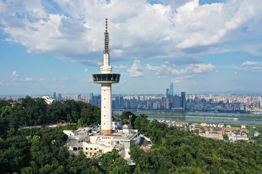 8月17日,位于岳麓山山顶的长沙广播电视发射塔焕新升级后,以“长沙之眼”观景平台的新身份亮相。该塔始建于1987年,是湖南省首座综合性广播电视发射塔。2013年,该塔因设施老化关闭。提质改造后的“长沙之眼”构建了三层立体观览体验,包含塔下观景平台、负一层“文化+科技”观光体验空间、沉浸式候梯厅互动体验及塔上360度高空观光厅等多维文旅空间。其中,塔下观景平台、负一层“文化+科技”观光体验空间免费对外开放。湖南日报全媒体记者 田超 摄