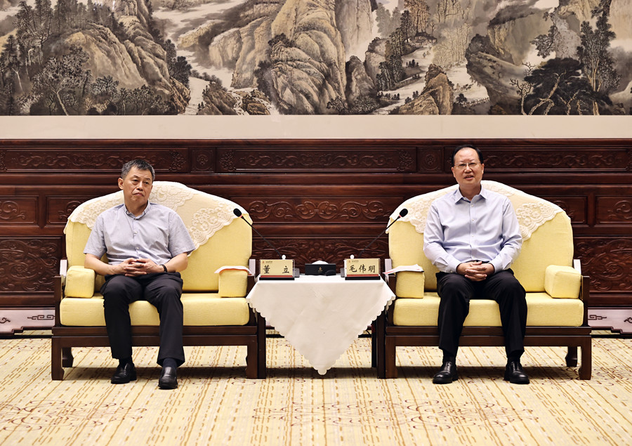 8月31日晚,省政府邀请出席通航产业博览会的嘉宾共商“蓝天”发展大计。图为省委副书记、省长毛伟明与中国人民解放军空军副司令员董立座谈。