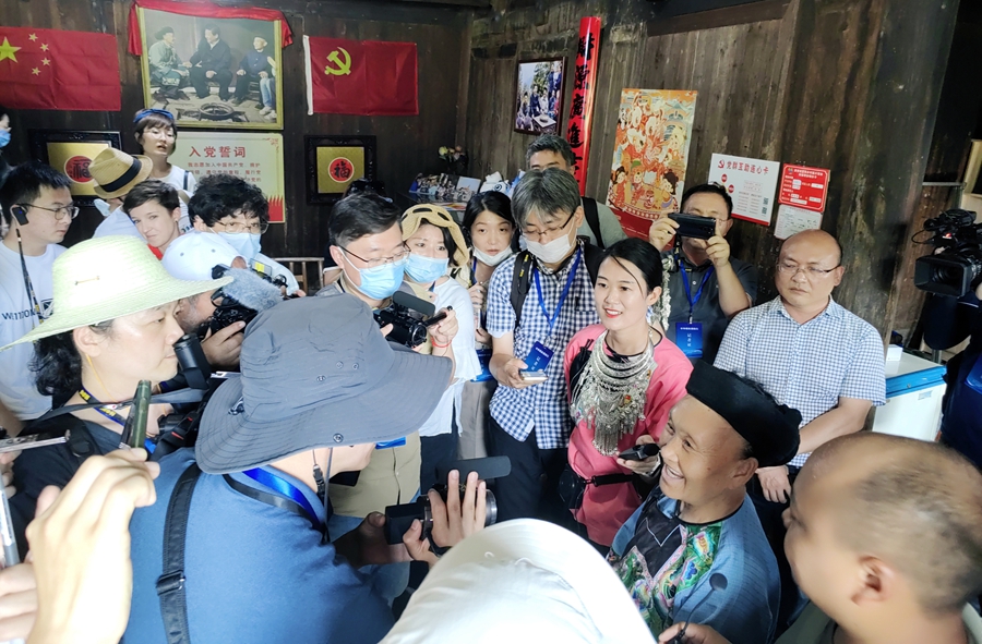 8月4日,中外记者们在精准扶贫首倡地——花垣县十八洞村采访石拔三老人(前排右二)。