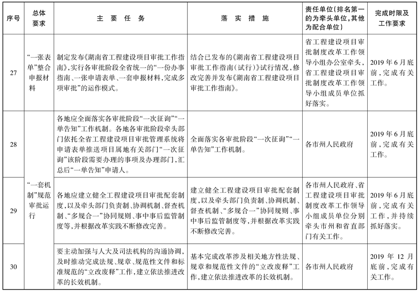(十一)“一张表单”整合申报材料。制定发布《湖南省工程建设项目审批工作指南》,实行各审批阶段全省统一的“一份办事指南、一张申请表单、一套申报材料,完成多项审批”的运作模式。各地工程建设项目审批综合服务窗口应建立对申请表单和申报材料清单的填报服务机制,主动告知申请人填报要求,不同审批阶段的审批部门依托全省工程建设项目审批系统共享申报材料,不得要求申请人重复提交。