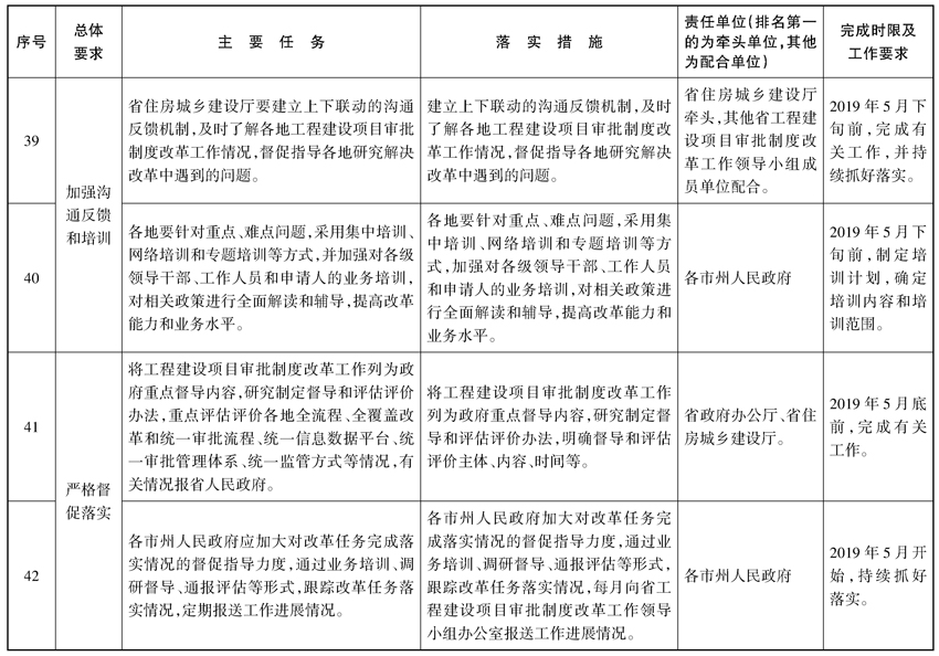 (十七)加强沟通反馈和培训。省住房城乡建设厅要建立上下联动的沟通反馈机制,及时了解各地工程建设项目审批制度改革工作情况,督促指导各地研究解决改革中遇到的问题。各地要针对重点、难点问题,采用集中培训、网络培训和专题培训等方式,加强对各级领导干部、工作人员和申请人的业务培训,对相关政策进行全面解读和辅导,提高改革能力和业务水平。