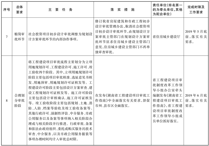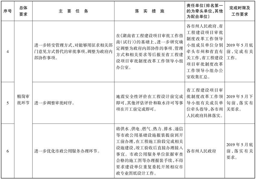(一)精简审批环节。在《湖南省工程建设项目审批工作指南(试行)》的基础上,进一步研究减少审批事项和条件,减少保留事项的前置条件,下放审批权限,合并审批事项;进一步转变管理方式,对能够用征求相关部门意见方式替代的审批事项,调整为政府内部协作事项;进一步调整审批时序,地震安全性评价在工程设计前完成即可,其他评估评价和取水许可等事项在开工前完成即可;进一步优化市政公用服务办理环节,将供水、供电、燃气、热力、排水、通信等市政公用基础设施报装提前到开工前办理,在工程施工阶段完成相关设施建设,竣工验收后直接办理接入事宜。市政公用服务单位依据审查合格的施工图等办理报装手续,不得要求建设单位重复委托开展相应市政专业图纸设计工作。社会投资项目初步设计审批调整为规划设计方案审批环节的内部协作事项。