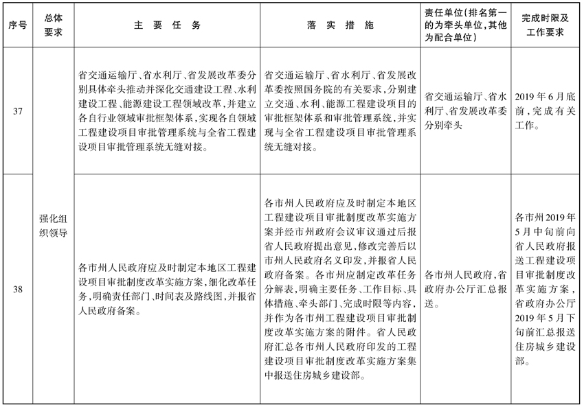 (十六)加强组织领导。省政府全面领导全省工程建设项目审批制度改革工作,成立全省工程建设项目审批制度改革工作领导小组。领导小组办公室设在省住房城乡建设厅,负责组织协调和督促指导责任。省发展改革委负责全省工程建设项目审批管理系统建设工作,省交通运输厅、省水利厅、省发展改革委分别具体牵头推动并深化交通建设工程、水利建设工程、能源建设工程领域改革,并建立各自行业领域审批框架体系,实现各自领域工程建设项目审批管理系统与全省工程建设项目审批管理系统无缝对接。省直其他部门单位要根据各自职能加强协作配合。各市州、县市区人民政府要高度重视工程建设项目审批制度改革工作,成立以主要负责同志为组长的领导小组,及时协调解决改革中的重要问题,确保改革工作顺利实施。各市州人民政府应及时制定本地区工程建设项目审批制度改革实施方案,细化改革任务,明确责任部门、时间表及路线图,并报省政府备案。
