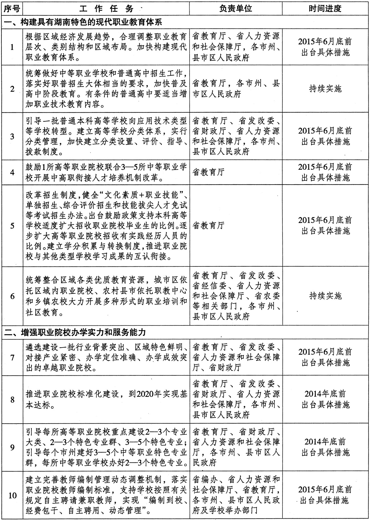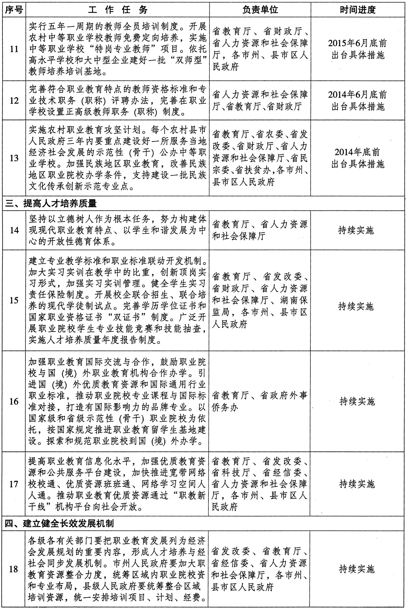 (三)目标任务。到2020年,形成与湖南区域经济社会发展紧密结合,结构完整、布局合理、保障有力、开放灵活,体现终身教育理念,与其他各类教育衔接沟通,办学水平国内一流、有效支撑和引领产业发展的具有湖南特色的现代职业教育体系。