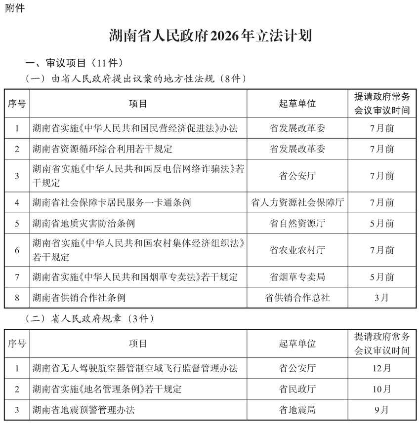 《湖南省人民政府2026年立法计划》已经省委、省人民政府同意,现印发给你们,请遵照执行,认真抓好落实。为确保省人民政府2026年立法计划高质高效实施,现就有关事项通知如下: