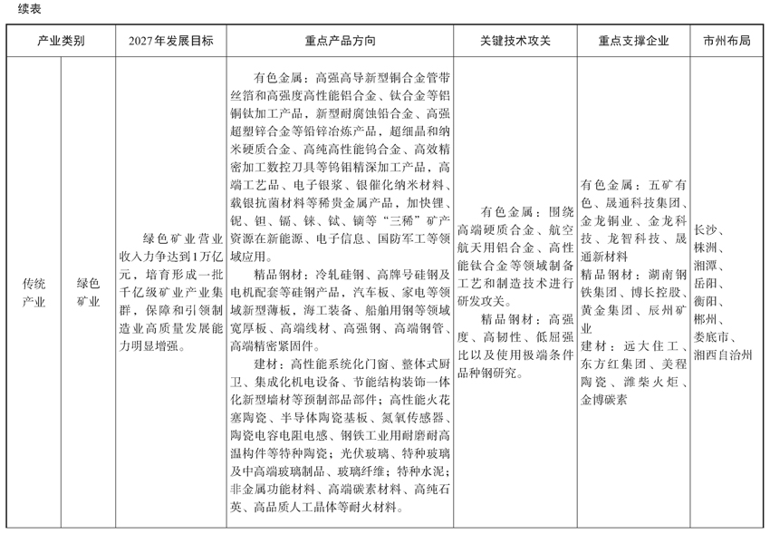 1.有色金属。铝铜钛加工,以湖南有色控股、晟通科技、金龙科技、湘投金天科技等为龙头,重点发展高强高导新型铜合金管带丝箔和高强度高性能铝合金、钛合金等产品,延伸铜铝钛产业链。铅锌加工,依托衡阳水口山、郴州铅锌冶炼产业集聚区,加快发展新型耐腐蚀铅合金、高强超塑锌合金等产品,完善铅锌复合材料产业链。钨钼精深加工,加快建设株洲、郴州硬质合金产业集群,重点发展超细晶和纳米硬质合金、高性能钨合金、高效精密加工数控刀具等产品。稀贵金属加工,依托湖南有色产业投资集团等龙头企业,加快发展高端工艺品、电子银浆、银催化纳米材料、载银抗菌材料等产品,形成高端金银精深加工产业链。加快锂、铌、钽、镉、铼、铽、镝等“三稀”(稀土、稀有、稀散)矿产在新能源、电子信息、国防军工等领域应用。