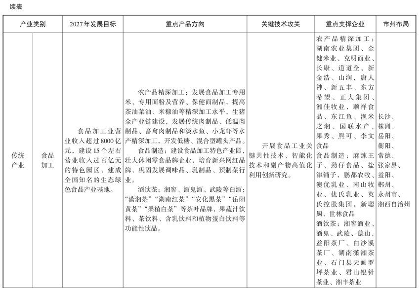 着力提高农副产品精深加工能力和质量安全水平,做强骨干龙头企业,打造“湘字号”知名品牌。到2027年,全省食品加工业营业收入超过8000亿元,建设15个左右营业收入过百亿元的特色园区,建成全国知名的生态绿色食品产业基地。