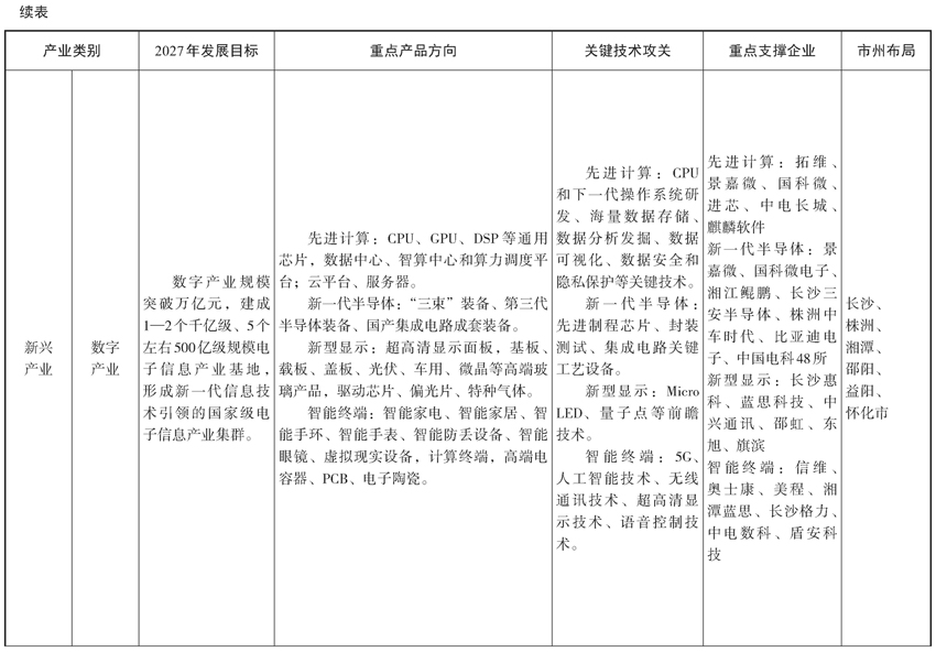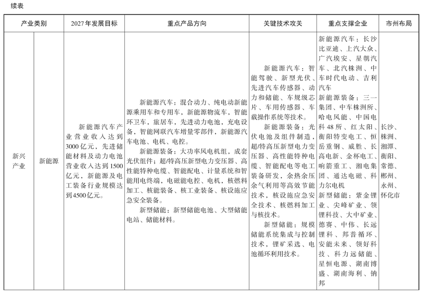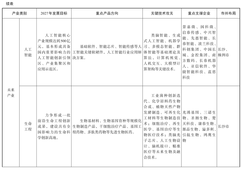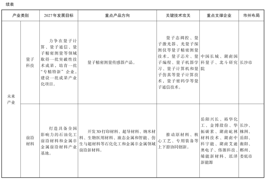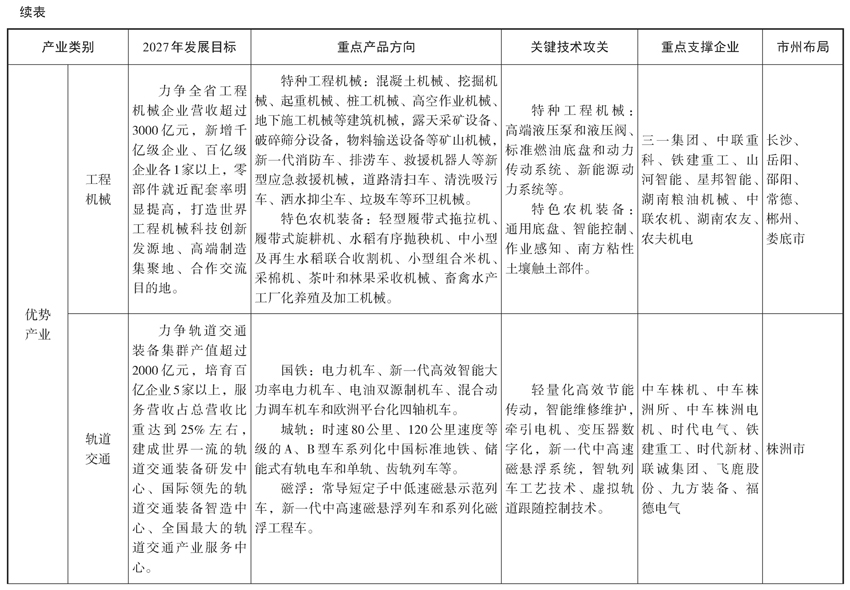 一核引领:依托长株潭国家自主创新示范区、湘江新区、湖南自贸试验区等国家级战略平台,支持长沙重点发展新一代信息技术、工程机械、新能源汽车、生物医药产业,率先布局人工智能、量子科技、前沿材料等未来产业,株洲重点发展轨道交通、航空航天(含北斗)、先进材料,湘潭重点发展新能源、钢铁材料、汽车产业,鼓励协同配套发展,共同打造具有国际竞争力的世界级先进制造业集群。