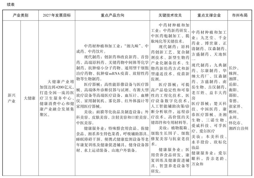 1.中医药。壮大“湘九味”道地药材产业,新建一批道地药材良种繁育、生态种植和初精深加工、趁鲜加工基地,研究制定湘产中药材国际标准、地方标准,开展湘产中成药大品种临床综合评价,推进中医药全产业链开发。发挥国家中医药传承创新中心、湘赣粤港澳中医药全产业链协同发展联盟等平台机制作用,加快推动中药创新研究和中药经典名方转化,开发保健食品、药食同源产品、特医食品,研发功能性药膳、药饮、药浴、药妆等健康产品。