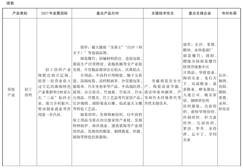 以湘南湘西地区为重点,积极承接沿海劳动密集型和加工贸易产业转移,培育一批“三品”标杆企业、外贸特色产业集群和加工贸易梯度转移重点承接地。到2027年,全省轻工纺织产业规模达到万亿级,培育一批营业收入过千亿元的湖湘特色产业集群。