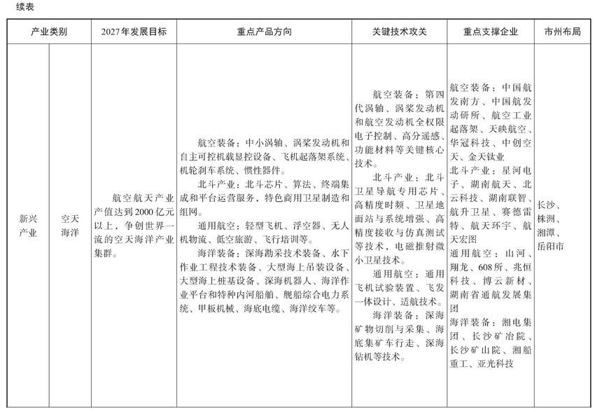 1.航空装备。依托中国航发南方、中国航发动研所、航空工业起落架等企业,加快发展通航整机、无人机、中小航空发动机、起降系统和辅助动力系统,推动新型飞行器及发动机整机布局,培育壮大通航整机、大飞机机载系统、航空航天新材料等标志性产业集群。主动对接中国商飞、中国航发等央企,在湘组建民机APU合资公司,加快机载系统研制和批产任务,壮大大飞机配套规模。依托中创空天、金天钛业等企业,加快发展钛、铍、铝、镁轻质合金等航天航空新材料。