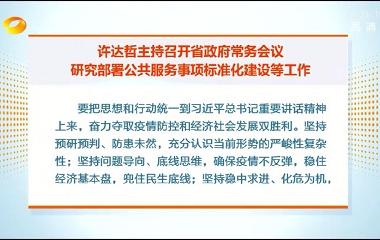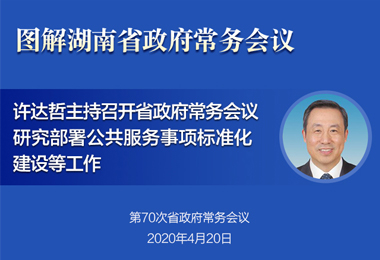 4月20日下午,省长许达哲主持召开省政府常务会议,学习贯彻中央有关会议、2019年脱贫攻坚成效考核情况通报和脱贫攻坚约谈会议、胡春华同志在湘督导讲话精神,研究部署公共服务事项标准化建设、消防执法改革、整治突出毒品问题等工作。[详细内容]