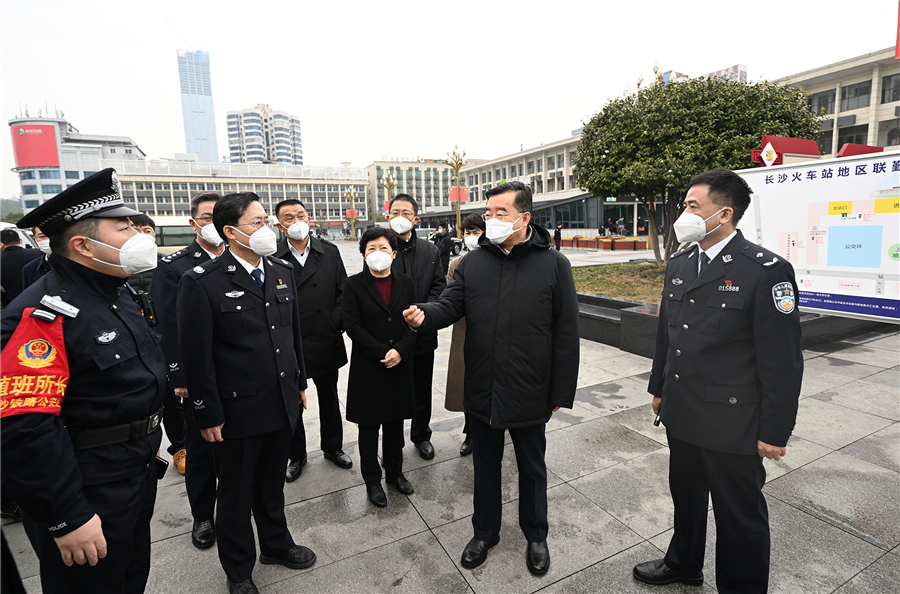 1月19日上午,省委书记、省人大常委会主任张庆伟在长沙市走访慰问基层一线工作人员。图为张庆伟在长沙火车站快警平台与公安干警、车站员工亲切交流。
