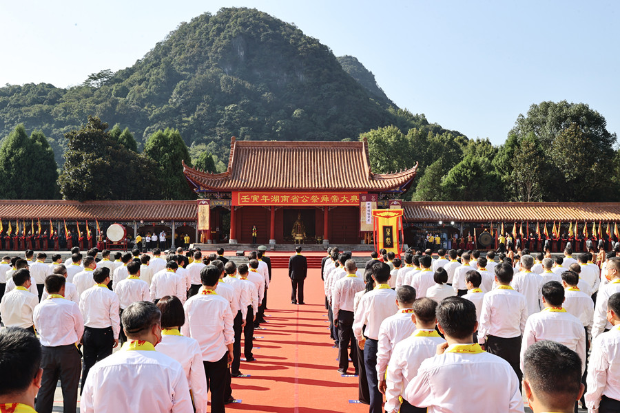 巍哉帝舜,粹矣德皇。芙蓉国里,花开向阳。9月7日上午,由湖南省人民政府主办,永州市政府、宁远县政府承办的壬寅年公祭舜帝大典,在中华道德文化始祖舜帝有虞氏安寝之地——宁远县九嶷山隆重举行。此次公祭还首次在老挝、澳门设立了分会场,200余名海内外各界嘉宾参加祭祀典礼,线上参祭超1500万人次。湖南省人民政府省长毛伟明主祭。