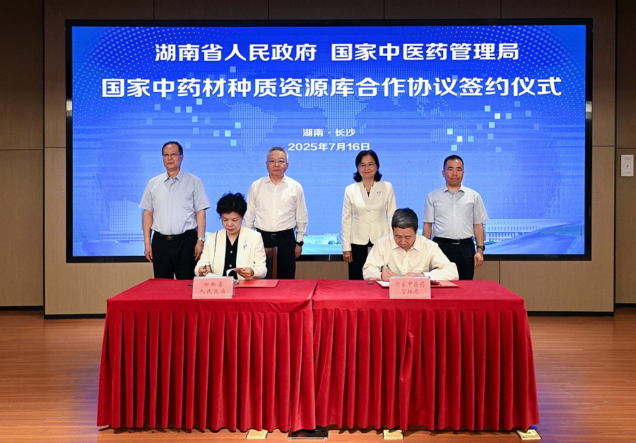 7月16日,湖南省人民政府与国家中医药管理局在长沙签署共建国家中药材种质资源库合作协议。省委书记沈晓明,省委副书记、省长毛伟明,国家卫生健康委党组成员、国家中医药管理局局长余艳红见证签约。