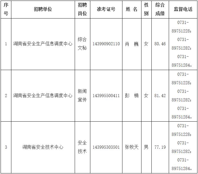 根据《湖南省省直事业单位2025年第四次集中公开招聘工作人员公告》有关要求,经报名、资格审查、笔试、面试、体检、考察等程序,确定肖巍等3名同志为湖南省应急管理厅所属事业单位2025年公开招聘拟聘用人员,现予以公示。