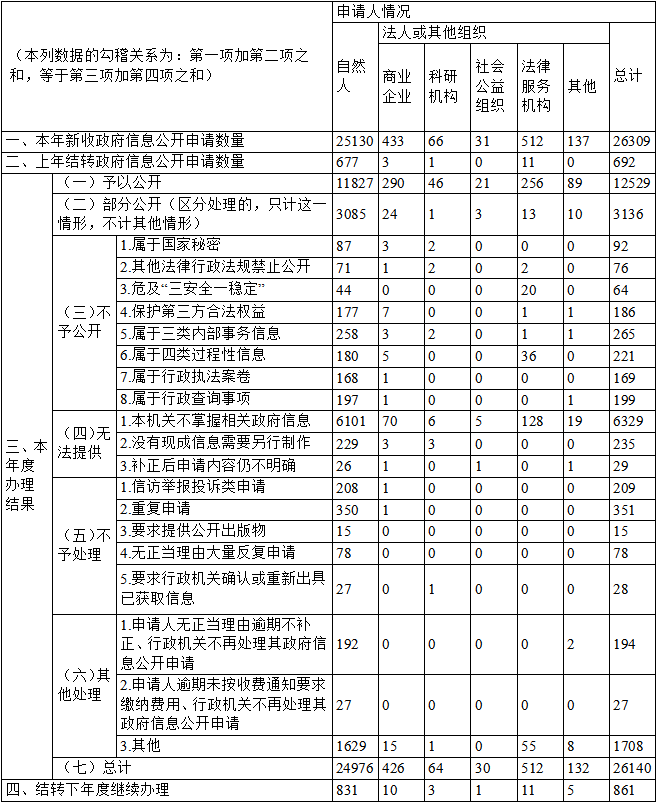 (二)依申请公开情况。制定出台省政府办公厅政府信息公开及政策解读规范,进一步规范省政府(办公厅)依申请公开办理流程。2025年,全省共收到政府信息公开申请26309件,结转上年度政府信息公开申请692件,共办理完成26140件,结转下年度继续办理861件。其中,省政府和省政府办公厅收到政府信息公开申请1935件,结转上年度政府信息公开申请31件,共办理完成1940件,结转下年度继续办理26件;发生行政复议1044件、行政诉讼3件。