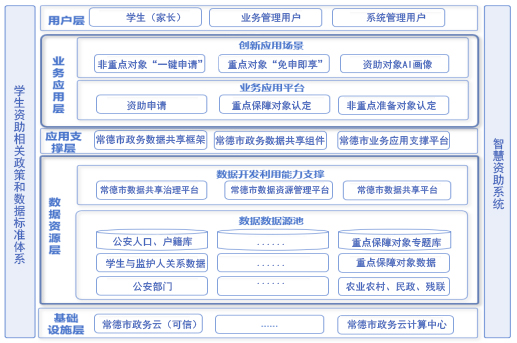 1.建成智慧资助系统。系统以政务数据共享为基础,以国家学生资助政策体系为支撑,基于现有教育业务平台,建设智慧资助系统。将资助政策宣传与学生升学、网上报到入学功能相融合,加入学生资助政策宣传内容,扩大政策宣传的有效覆盖面;通过大数据比对和筛查,自动识别重点保障对象,无需学生及家长提供佐证材料,实现重点保障对象学生资助“免申即享”;非重点保障对象申请学生资助只需一键确认,无需纸质申请,后续通过大数据比对,筛除不符合条件的申请对象,再由学校按规定流程开展资格认定工作,通过数据流动和学校认定,学生(家长)申请资助“办事‘0’证明”,学生资助对象的认定高效且精准;后续,通过不断优化和升级,通过获得更多的公共数据资源,在AI智能化手段的加持下,实现对所有家庭经济困难学生资助的“免申即享”、“无感资助”。