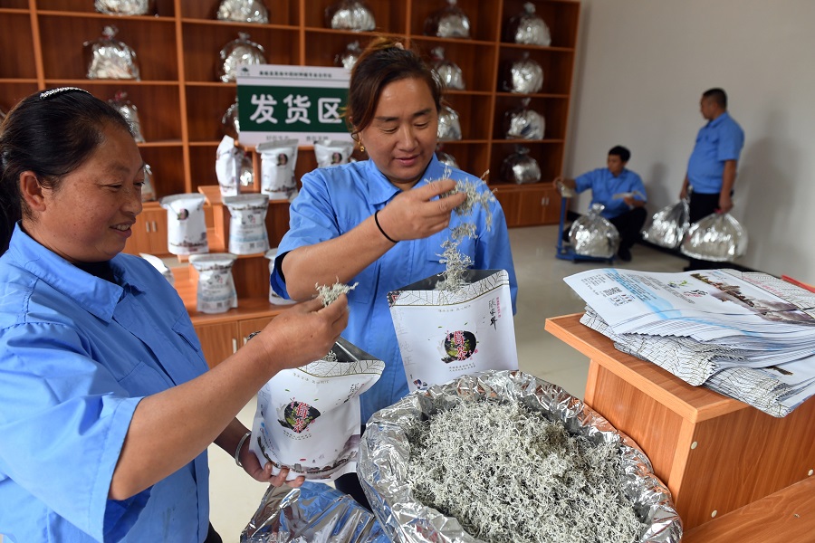 10月15日,桑植县官地坪镇梯市村,村民在加工包装莓茶。