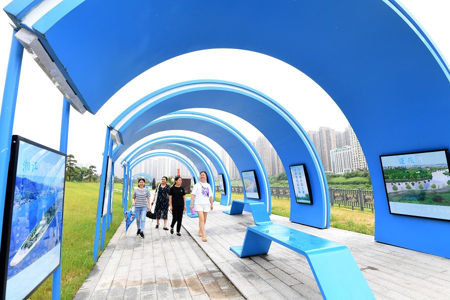 6月13日,市民在参观长沙市岳麓区靳江河水文化长廊。岳麓区在靳江河风光带(洋湖湿地公园段)打造的水文化长廊,以蓝色为主色调,以水花、浪花和波浪线条为造型,展示了水文化历史、河长制与水资源、防汛等科普知识。湖南日报全媒体记者 田超 摄