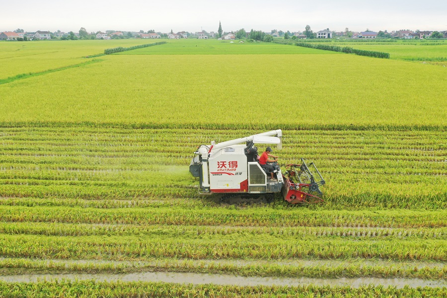 7月6日,澧县城头山镇车溪河社区,农民驾驶收割机收割早稻。时下,该县29万余亩早稻陆续成熟,当地农民抢抓农时收割,确保颗粒归仓。柏依朴 刘曼思 摄影报道