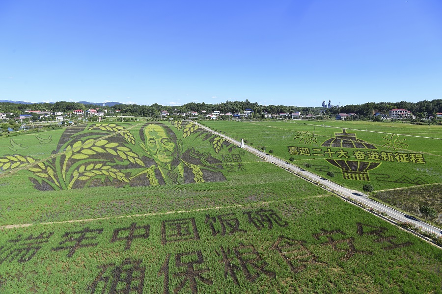 8月12日,长沙县江背镇五福村,300位农民以水田为纸、秧苗为笔,在600亩水田里种出了以袁隆平院士形象为主图的水稻画,用丰收感恩、缅怀袁老。湖南日报全媒体记者 辜鹏博 摄