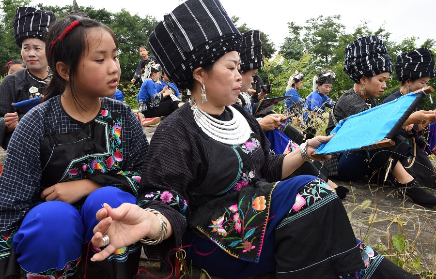 7月18日,吉首市乾州街道关侯村,苗绣传承人在展演苗绣技艺。当天,该市举行非遗进村寨展示展演活动,非遗传承人纷纷登台展演苗族鼓舞、苗族民歌、苗族狮舞、花灯跳桌等非遗节目,展示非遗文化焕发的新活力。姚方 杨燕萍 摄影报道
