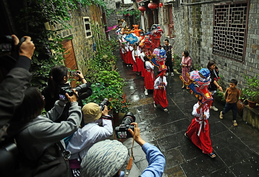 10月5日,摄影爱好者在吉首市乾州古城拍照采风。“双节”假期,吉首市各大景区人潮涌动,游客们观历史文化街区,赏多彩“非遗”文化,乐享假期。姚方 杨燕萍 摄影报道