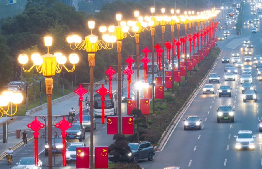 9月30日,长沙市岳麓大道,两旁路灯杆悬挂起了鲜艳的国旗,营造出浓厚的节日喜庆氛围。湖南日报全媒体记者 辜鹏博 摄