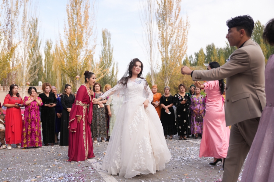 10月14日,新疆吐鲁番市鄯善县连木沁镇阿斯坦村,一对新婚夫妇与亲朋好友载歌载舞,共同庆祝幸福时刻。近年来,湖南省第十批援疆工作队分批投入650万元援疆资金,启动阿斯坦村基础设施提质与民生改善工程建设。目前,援疆桥、河畔美食广场、露营基地和休闲步道四项工程已全部建成,稳稳托起村民的幸福生活。湖南日报全媒体记者 辜鹏博 摄