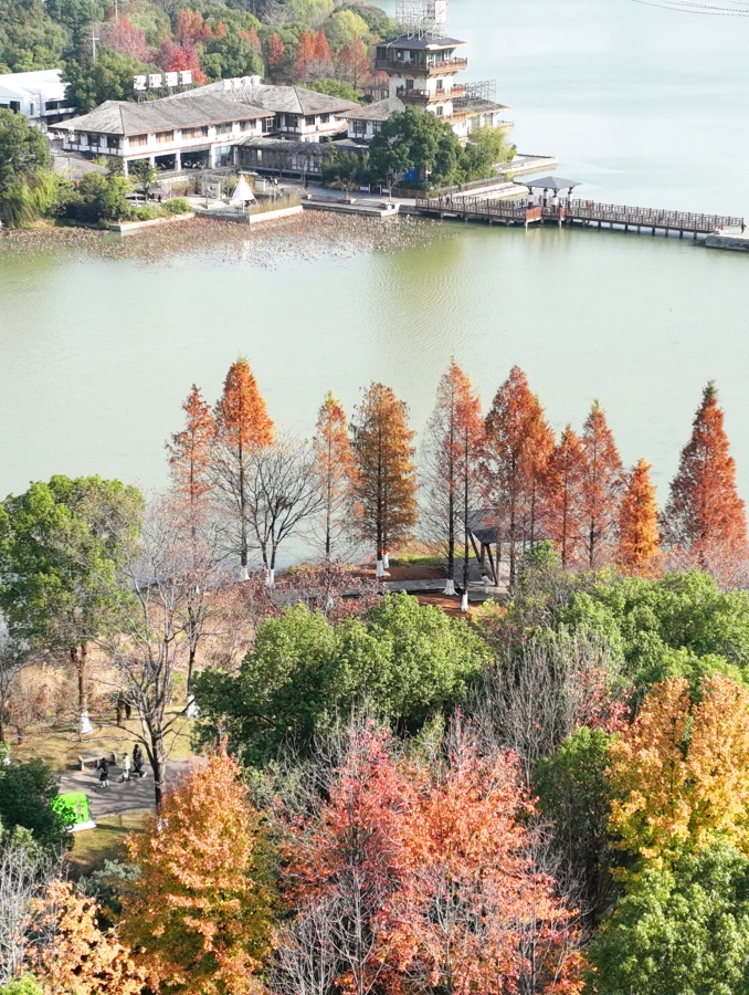 12月13日,长沙市开福区月湖公园,红黄绿相间的树木与清澈湖水交相辉映,构成一幅人与自然和谐共生的美丽画卷。 湖南日报全媒体记者 李健 摄