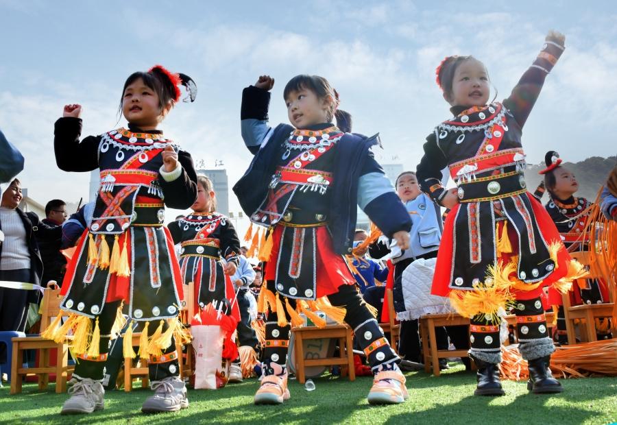 12月19日,吉首市第四幼儿园,萌娃在表演节目。当天,该园举行“鼓舞童心,情润湘西”第二届鼓文化节,萌娃们通过“鼓风鼓韵”等特色活动体验非遗魅力,在趣味互动中传承优秀民族文化。 姚方 杨燕萍 摄影报道(湖南图片库)