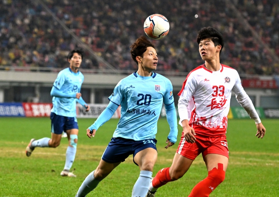 12月24日晚,球员在雨中拼抢。当天,长沙队VS大湾区湖南人队湘超友谊赛在长沙贺龙体育场举行,长沙队以3∶2获胜。湖南日报全媒体记者 郭立亮 摄