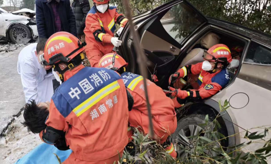 1月20日,临澧县望城街道,两辆小车因冰雪路面湿滑发生碰撞,导致车体变形、两人被困。县消防救援大队赶赴现场,在风雪中破拆车辆,成功救出被困人员。陈自德 摄(湖南图片库)