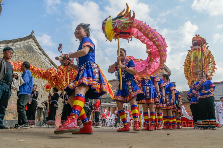 2月14日,江华瑶族自治县大路铺镇神岗古村,村民在舞龙。当天,该村举行马年“村晚”,村民开展形式多样的民俗活动喜迎新春,吸引众多游客参与体验。蒋克青 摄(湖南图片库)