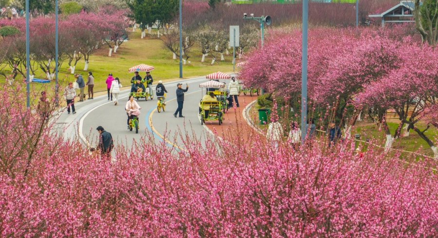 2月21日,湖南松雅湖国家湿地公园,数百株红梅迎春绽放,暗香浮动。众多市民游客前来赏景漫步,在明媚春光中感受盎然生机。 湖南日报全媒体记者 李健 摄