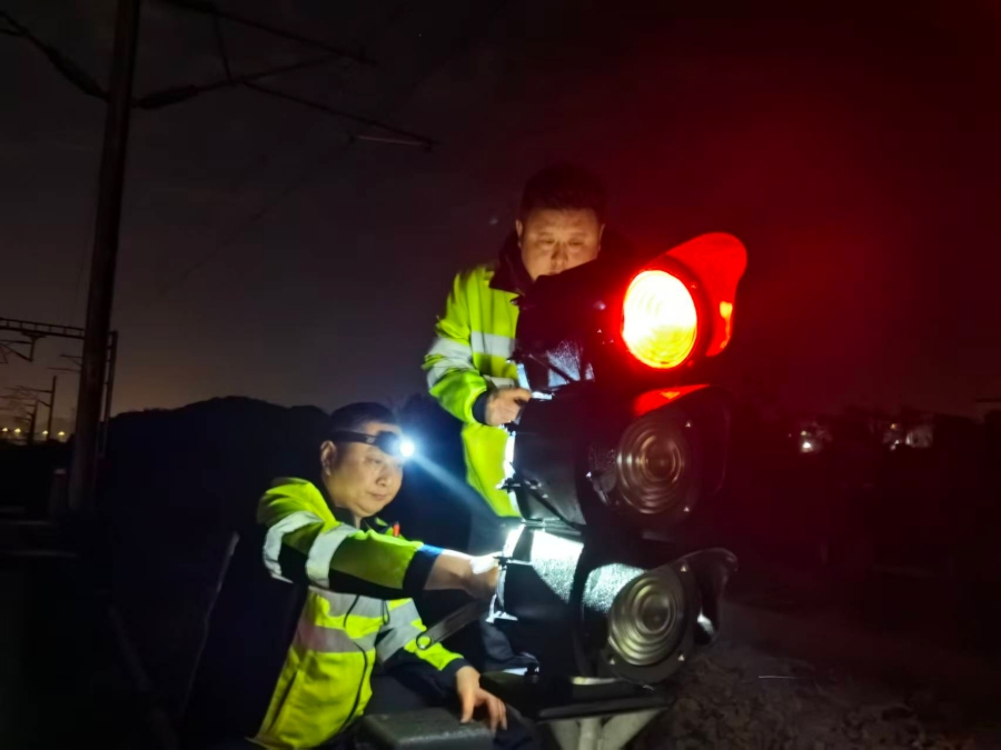 2月21日凌晨,中国铁路广州局集团有限公司长沙电务段城际信号车间工人,在长株潭城际铁路株洲南站检修信号设备。连日来,该段干部职工坚守岗位,加强设备维护,全力护航春运返程安全。刘锦标 胡志刚 摄影报道(湖南图片库)