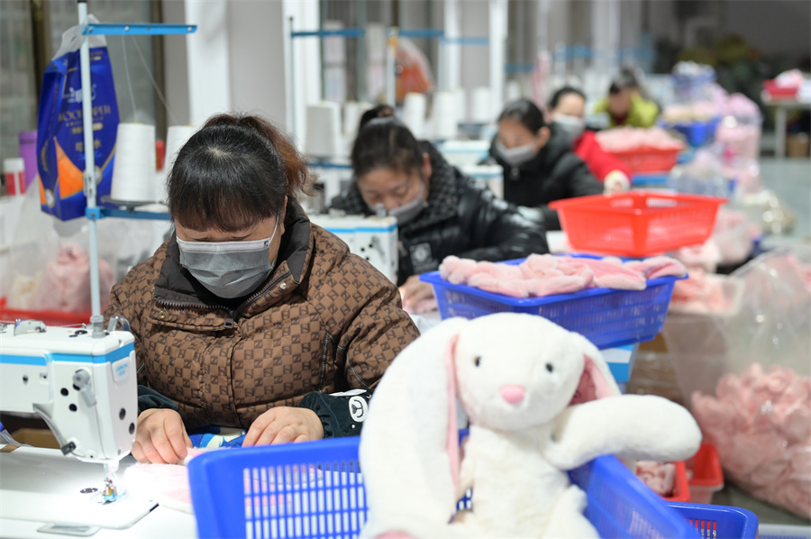 3月1日,双峰县扶光纺织厂,工人在加工出口海外的毛绒玩具。新春伊始,该县企业开足马力进入“满产模式”,全力冲刺首季“开门红”。李建新 李海英 摄影报道(湖南图片库)