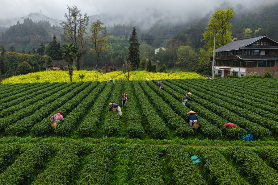 3月22日,通道侗族自治县菁芜洲镇车控村,茶农在茶园采摘春茶。春分时节,该县茶园迎来采摘季,茶农抢抓时令采摘春茶,呈现一派繁忙景象。李尚引 摄