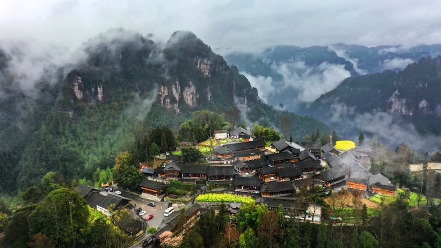 3月23日,花垣县双龙镇十八洞村。烟雨朦胧中,金黄的油菜花与粉红的桃花点缀着苗寨,构成一幅动人的乡村画卷。龙恩泽 摄(湖南图片库)
