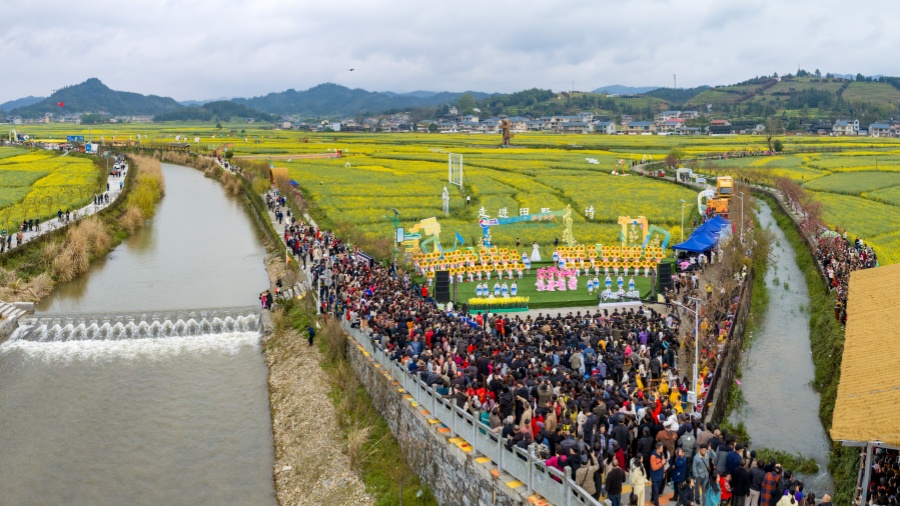 3月28日,“田野生花·湘村如歌”2026年全国“四季村歌”示范活动在会同县堡子镇稻香诗田景区启幕。这场以万亩油菜花海为天然舞台的沉浸式文化活动,以村歌为纽带,融合农耕民俗、民族风情与时代旋律,生动展现了新时代乡村风貌,为全国“四季村歌”活动奏响春之序曲。张镭 摄(湖南图片库)