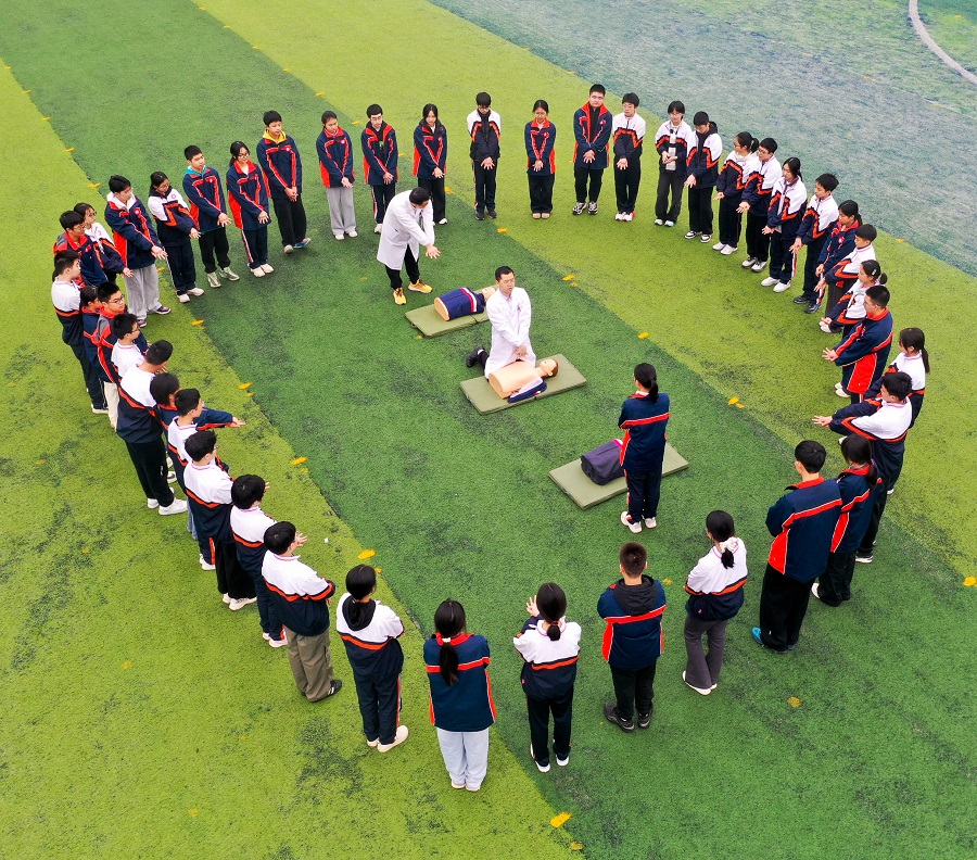 3月30日是全国中小学生安全教育日,衡阳县实验学校联合县妇幼保健院开展“同守护、共成长”主题活动,提升学生安全防护意识和应急救护能力。图为医护人员在指导学生进行心肺复苏急救技能练习。刘欣荣 摄