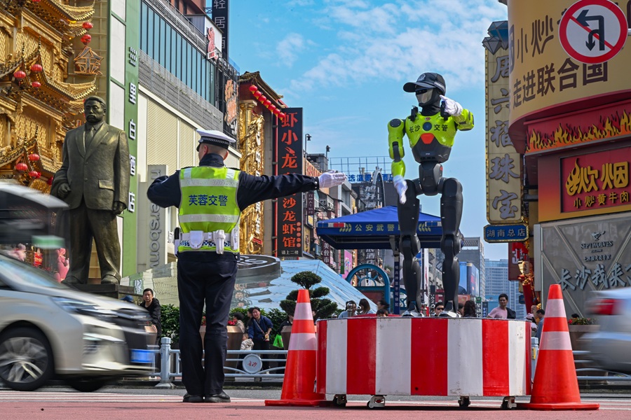 4月1日,智能交通指挥机器人在长沙市司门口正式上岗。该机器人具备路口指挥、安全宣教、智能动态劝导等多项实用功能,可有效分担一线交警重复性执勤工作,助力长沙智慧交通建设。湖南日报全媒体记者 郭立亮 摄