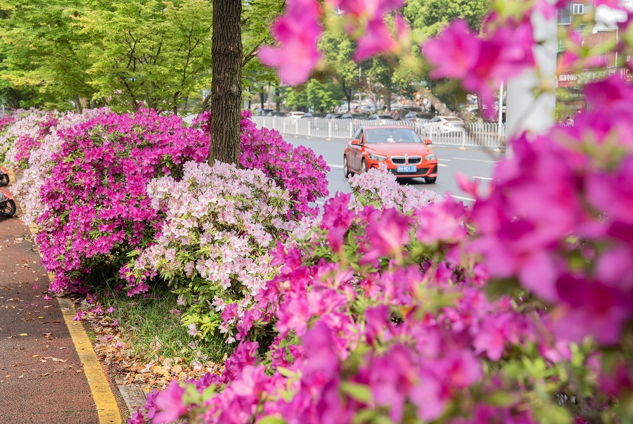 4月12日,长沙市岳麓区杜鹃路两侧绿化带,粉、红相间的杜鹃花竞相绽放,与林木、车流相映成趣。目前,该主干道杜鹃花迎来盛花期,姹紫嫣红的花海沿道路绵延铺展,成为春日里一道亮丽的风景。湖南日报全媒体记者 李健 摄